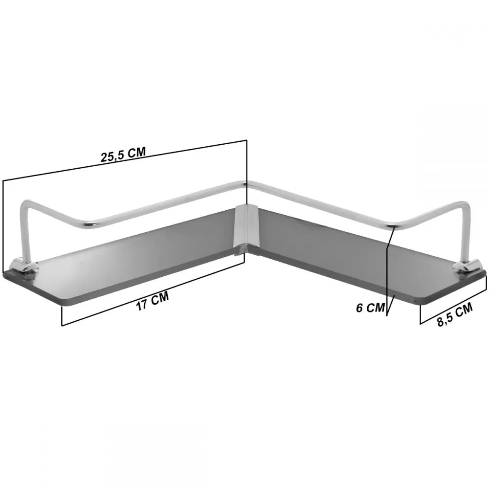 Descrição PORTA SHAMPOO EM L COM VIDROMATERIAL: METAL CROMADOCOR DO VIDRO: FUMEACOMPANHA PARAFUSOS, BUCHAS E ACABAMENTOS PARA FIXAÇÃOMEDIDAS:25,5 CM X 25,5CM