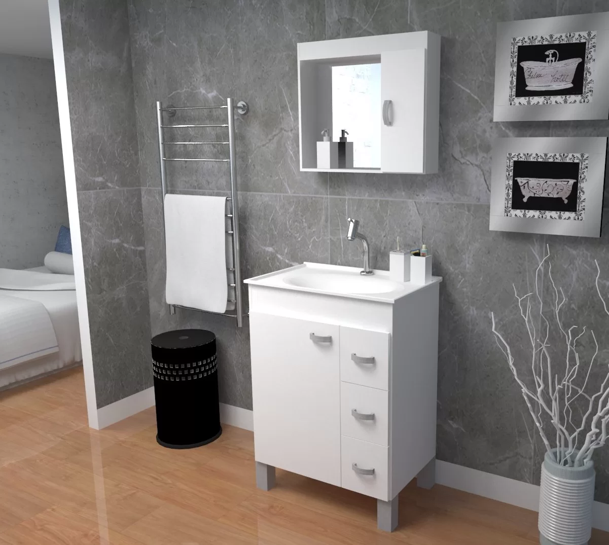 PRODUTO ACOMPANHA:GABINETE COM 1 PORTA E 3 GAVETAS ESPELHEIRA COM 1 PORTA CUBA EM MÁRMORE SINTÉTICO04 PÉSPODE SER UTILIZADO COM OS PÉS OU SUSPENSO SEM UTILIZAR OS PÉSMEDIDAS GABINETE COM A CUBA::COMPRIMENTO: 60 CMALTURA:SEM PÉS 70 CM COM OS PÉS 82 CMPROFUNDIDADE: 37 CMMEDIDA ESPELHEIRA:COMPRIMENTO: 51 CMALTURA: 45 CMPROFUNDIDADE: 12 CMMEDIDA ESPELHO:COMPRIMENTO: 33 CMALTURA: 38 CM
